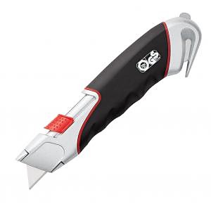 Rezač s funkciou plne automatického návratu čepele, t. j. čepeľ sa rýchlo po rezaní zasunie späť. Ergonomický kovový úchyt s gumenou zónou, trapézová pružinová čepeľ, integrovaná krytá okrúhla čepeľ na konci rezača umožňuje bezpečné rezanie zmršťovacej fólie, káblov, pásikov a pod. Vhodný pre pravákov i ľavákov. Dodávaný vrátane trapézového a okrúhleho noža 25 mm z karbónovej ocele. Schválené inštitútom TÜV. Farba čierna/ červená.| Vlastnosti produktu | |