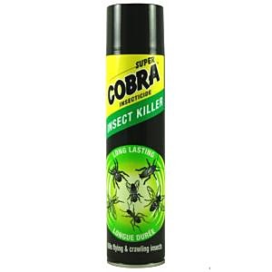 Super Cobra insekticídny prípravok na hubenie lietajúceho aj lezúceho hmyzu. Hubí lietajúci aj lezúci hmyz v domácnostiach aj vonkajších priestoroch. Rýchlo a účinne hubí lietajúci hmyz ako muchy, komáre, osy, mole, ovady a iné. Pôsobí okamžite a dlhotrvajúco na všetok lezúci hmyz, napr. mravce, šváby a iné. Účinnosť : Muchy - 99% úmrtnosť po 14 hodinách, komáre - 99% úmrtnosť po 24 hodinách. Lezúci hmyz - 100% úmrtnosť po 48 hodinách.| Vlastnosti produktu | |