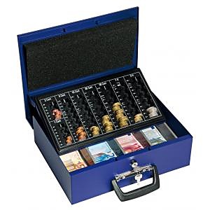 Pokladnička vybavená mincovou priehradkou s ôsmimi oddielmi na eurá a centy a štyrmi prístupnými priehradkami na bankovky. Pena na vnútornej strane veka na zabránenie premiešania mincí pri prenose, dve madlá na prenos pokladničky. K zámku sú dodávané dva kľúče.| Vlastnosti produktu | |