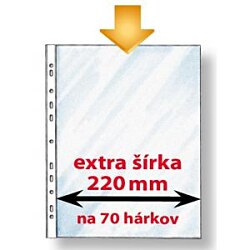 Obal s eurodierovaním vhodný na zakladanie materiálov rozšíreného formátu A4. Povrch matný, otvor zhora. Hrúbka 50 mic. Vnútorné rozmery obalu 305 × 220 mm. Balenie 50 ks v PE sáčku.| Vlastnosti produktu | |
