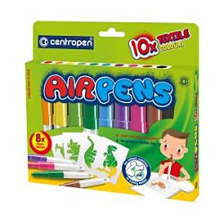 Fúkacie fixy na textil v sade 10 ks s 8 šablónami. Zdraviu neškodlivý atrament. Kresby odolajú praniu do 60 °C bez nutnosti zažehlenia.| Vlastnosti produktu | |