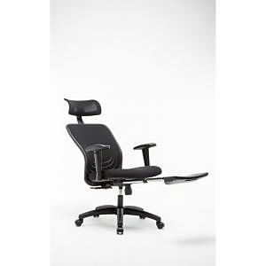 Ergonomická kancelárska stolička s opierkou hlavy, podrúčkami a podperou na nohy.