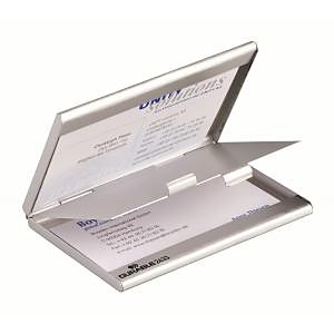 Elegantná a praktická hliníková krabička na vizitky. Vnútorné rozmery 90 × 55 mm. Kapacita 2 × 10 vizitiek. Vnútorný priestor rozdelený priečkou na 2 časti. Matná úprava. Farba strieborná.| Vlastnosti produktu | |