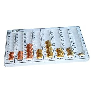 Samostatná mincová priehradka z plastu. Zo spodnej strany zabezpečená proti kĺzaniu štyrmi gumovými nožičkami. Rozmerovo vhodná do bežnej stolovej zásuvky. Maximálna kapacita obnosu 246,40 Euro.| Vlastnosti produktu | |