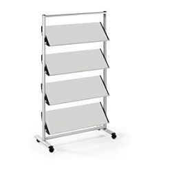 Vysoko kvalitný elegantný a pevný mobilný prezentačný stojan na časopisy alebo katalógy formátu A4. Stojan je dodávaný v rozloženom tvare. Materiál kov. Farba svetlosivá/-čierna. Štyri police s možnosťou fixácie v 3 sklonoch na max. 12×A4 formátov.| Vlastnosti produktu | |