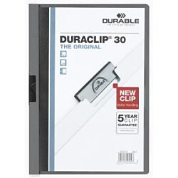 Obal vyvinutý spoločnosťou DURABLE pre viazanie nedierovaných listov. Materiál z PVC s unikátnym kovovým klipom, ktorý sa prispôsobí vloženému počtu listov a priehľadnou prednou stranou. Ideálny na prezentácie, ponuky, správy, poznámky na konferencie, semináre a pod. Formát A4. Kapacita 1-30 listov. Väčšie balenie 25 ks.| Vlastnosti produktu | |