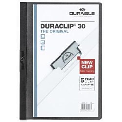 Obal vyvinutý spoločnosťou DURABLE pre viazanie nedierovaných listov. Materiál z PVC s unikátnym kovovým klipom, ktorý sa prispôsobí vloženému počtu listov a priehľadnou prednou stranou. Ideálny na prezentácie, ponuky, správy, poznámky na konferencie, semináre a pod. Formát A4. Kapacita 1-30 listov. Väčšie balenie 25 ks.| Vlastnosti produktu | |