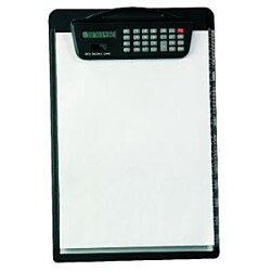Pevná písacia podložka A4 z tvrdého plastu s kovovým klipom a kalkulačkou, umiestnenou na klipe.| Vlastnosti produktu | |