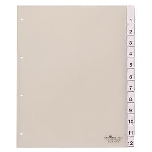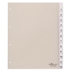 Polypropylénový rozraďovač s výmennými indexami vhodný na rozlíšenie zakladacích obalov. Formát A4 maxi, eurodierovanie, bez titulného listu. Súčasťou balenia sú náhradné výmenné indexy s mesiacmi JAN----DEZ. Balenie jedna sada v polyesterovom sáčku. Väčšie balenie 20 sád. Farba priehľadná.| Vlastnosti produktu | |