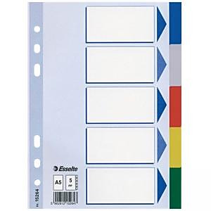 5-dielny plastový farebný rozraďovač. Euro-dierovanie, titulný popisovateľný list. Formát A5. Balenie jedna sada v polyesterovom sáčku. V kartóne 20 sád.| Vlastnosti produktu | |