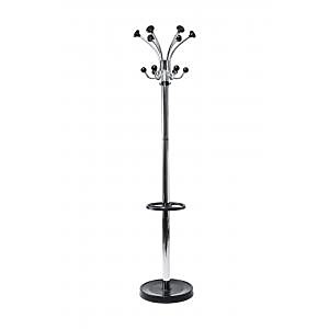 Elegantný oceľový vešiak na kabáty je zvlášť vhodný do priestorov s vysokou expozíciou, napr. kaviarne, čakárne a pod. Ťažký betónový podklad potiahnutý plastom zabezpečuje jeho mimoriadnu stabilitu. Matný povrch odolný proti poškriabaniu dáždnikom, lesklý stĺpik, 6 vešiakov na klobúky, 6 na kabáty s priskrutkovanými hrotmi z odolného z ABS plastu, 4 prídavné plastové háčiky pod vešiakmi a 4 háčiky na stojane na dáždniky, stojan priemeru 27 cm až na 8 dáždnikov alebo 4 teleskopické dáždniky. Výška 176 cm, priemer základne 36,5 cm, váha 6 kg. Rýchla a jednoduchá montáž. Farba strieborná / čierna.| Vlastnosti produktu | |