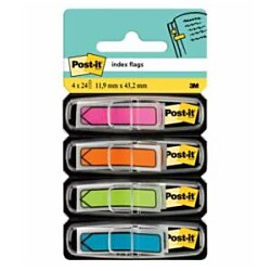 Úzke acetátové záložky do kníh, časopisov, ako register do cenníkov, kartoték, katalógov, zakladačov, archívov a pod. Priehľadná lepiaca čast a farebná časť na označenie.Prelepiteľné, znovunalepiteľné a popisovateľné. Rozmery záložky 11,9 x 43,1 mm. Dodávané v kombinácii 4 základných (červená,oranžová, modrá, žltá) alebo 4 neónových farieb )žltá, fialová, ružová. modrá) po 24 lístkov.Záložky s potlačou šípky upozorňujú na konkrétnu informáciu v texte. Šírka indexu 11,9 mm, v balení 4 farby po 24 lístkov.| Vlastnosti produktu | |