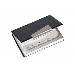 Elegantná krabička na vizitky a magnetické karty, vyrobená z vysokokvalitnej kombinácie hliníka a imitácie kože. Poskytuje bezpečné skladovanie a dokonalú ochranu až pre 20 vizitiek max. rozmerov 90 × 58 mm. Vonkajšie rozmery (š × h × d) 95 × 65 × 12 mm.. Farba čierna. Kapacita 20 vizitiek.| Vlastnosti produktu | |