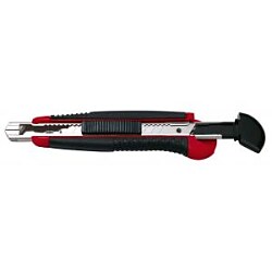 Robustný profesionálny rezač s gumeným vrúbkovaným úchytom, pevným celokovovým vedením noža a automatickým uzamknutím noža. Po vytiahnutí opotrebovaného noža sa zasunutím bežca nainštaluje z integrovaného zásobníka automaticky nôž nový. Šírka čepele 9 mm. V balení 6 náhradných čepiel. Schválené inštitútom TÜV. Farba čierna/červená.| Vlastnosti produktu | |