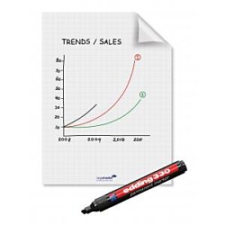 Rolka fólie s 25 štvorčekovanými listami (rozmer štvorčeka 2,5 × 2,5 cm) z bieleho polypropylénu v šírke 60 cm. Perforácia po 80 cm. Popisovanie permanentnými popisovačmi (edding). Elektrostatický náboj umožní priľnutie filmu na rôzne povrchy - sklo, stenu, drevo a tapetu bez použitia lepidla. Fóliu jednoducho odmotáte, v perforovanom mieste odtrhnete a zľahka pritlačíte na daný povrch. Na obale hárku je perforácia na uchytenie balenia na flipchartovú tabuľu. Povrch fólie umožní tiež udržanie papierových poznámok bez ich nalepenia. Väčšie balenie 4 blokov.| Vlastnosti produktu | |