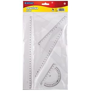 Rysovacia súprava trojuholník s ryskou 45°/177, trojuholník 60°/250, uhlomer 180°/100 s ryskou a pravítko 30 cm, číry plast.| Vlastnosti produktu | |