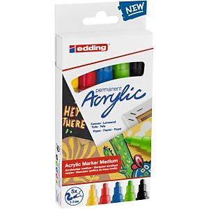 Akrylový popisovač na maľovanie na svetlé alebo tmavé povrchy, ideálny na materiály ako plátno alebo maliarsky papier. Šírka stopy okrúhleho hrotu je 2-3 mm. Vysoko kvalitná pigmentovaná akrylová farba na báze vody je po zaschnutí permanentná, nepriehľadná, svetlostála a bez zápachu. Súprava obsahuje čiernu, dopravnú červenú, enciánovomodrú, dopravnú žltú a žltozelenú farbu. Dodávaný v kvalitnom, znovu použiteľnom puzdre. Vhodné náhradné hroty (edding 5100 náhradné hroty) sú dostupné. Sada 5 kusov. Farba základný mix.