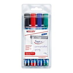 Popisovač s atramentom na vodnej báze a vlastnosťou Cap off, zabraňujúcou vysychaniu atramentu pri otvorenom hrote aj niekoľko dní. Na popisovanie flipchartových blokov a iných archov papiera. Opätovne naplniteľné atramentom FTK 25 (obj. kód ED625101-4), ktorý neprepíja na druhú stranu papiera. Hrot okrúhly, Šírka stopy 1,5 - 3 mm. Sada 4 farieb.| Vlastnosti produktu | |