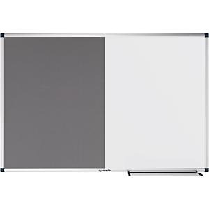Priestorovo úsporná dvojfunkčná doska na písanie a pripínanie. Hladké písanie a výkon suchého vymazávania. Jednoduché pripevnenie poznámok, náčrtov a fotografií pomocou magnetov a špendlíkov. Jednoduchá skrytá montáž na stenu. 5 ročná záruka na dokonalú popisovateľnosť a stierateľnosť povrchu dosky pri použití v kombinácii s príslušenstvom Legamaster. Tento produkt je vyrobený z materiálu z dobre obhospodarovaných lesov s certifikátom FSC® a iných kontrolovaných zdrojov (FSC C158462). Funkčná tabuľa a nástenná tabuľa na príležitostné použitie v kancelárii alebo domácej kancelárii. Jedna polovica: Magnetická lakovaná oceľová tabuľa vhodná na popisovanie za sucha stierateľnými popisovačmi na tabuľu. Druhá polovica: Nástenka s plsteným povrchom. Hliníkový rám so sivými plastovými rohovými krytmi (Pantone 433C). Možno namontovať horizontálne alebo vertikálne. Zásobník na popisovace (30 cm) s koncovými krytmi, montážna sada a montážny návod sú súčasťou balenia.| Vlastnosti produktu | |