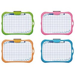 Tabuľka KEYROAD Mini na sucho stierateľná, obojstranná (hladká/kockovaná). Protipráskavý náter, flexi, umývateľný, farebné gumené rámy. Fixka a mini hubka súčasťou balenia. Závesná konzola, rozmer: 205 x 287 x 17mm. Farba dosky: biela, farba rámu: mix farieb.| Vlastnosti produktu | |