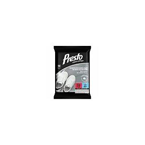 PRESTO CLEAN - VLHČENÉ OBRÚSKY NA BIELU OBUV 15 KS. Presto Clean vlhčené utierky na biele topánky sú praktickým riešením na rýchle a efektívne čistenie a ošetrovanie bielych topánok, ktoré sú náchylné na špinu a škvrny. Tieto špeciálne navrhnuté utierky okamžite odstraňujú nečistoty, prach a škvrny z povrchu topánok, čím udržiavajú ich pôvodnú belosť a čistý vzhľad. Vďaka svojmu zloženiu Presto Clean utierky šetrne čistia rôzne materiály, vrátane kože, syntetických materiálov a textílií, bez toho, aby zanechávali škvrny alebo stopy. Sú ideálnym pomocníkom na rýchle čistenie v teréne alebo doma, a zároveň zanechávajú topánky svieže a žiarivé. Ich kompaktné balenie je vhodné na cesty, takže si môžete svoje biele topánky udržiavať čisté kdekoľvek a kedykoľvek. Hlavné vlastnosti: Efektívne odstraňujú prach, špinu a škvrny. Vhodné na biele kožené, syntetické a textilné topánky. Nezanechávajú šmuhy ani stopy Jednoduché použitie - ideálne na cesty alebo rýchle čistenie.| Vlastnosti produktu | |
