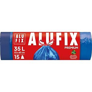 Vrecia na odpadky Premium, zaťahovacie, vyrobené z LDPE materiálu, modré. Vrece je pevné, určené do domácností alebo kancelárie a vďaka zaťahovaciemu systému veľmi praktické. Rozmer vreca 53 x 60 cm, objem 35 litrov, množstvo 15 ks na rolke, hrúbka 20 mikrónov.| Vlastnosti produktu | |