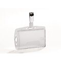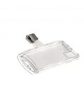 Plastová visačka na jednu plastovú identifikačnú kartu z priehľadného pružného plastu vysokej kvality, z prednej strany otvorená. Vhodná na ochranu magnetických a bezpečnostných kariet pred poškodením. Uchytenie klipu na kratšej alebo dlhšej strane poskytuje univerzalitu pri použití horizontálne alebo vertikálne označených kariet. Výsuvný kotúčik čiernej farby s