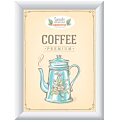 Rámček vyyrobený z odolného hliníka, má priehľadné plastové predné sklo. Zadná strana z HDF drevenej dosky. Rozskrutkovanteľné rohy v zadnej časti. Priložený háčik na zavesenie. Rozmer: 210 x 297 mm. Farba strieborná.