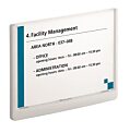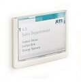 Moderná informačná tabuľka na dvere s lemom v atraktívnej bielej farbe. Predný panel sa otvára na jedno zatlačenie, a tým sa jednoducho sprístupnia vložené popisné papiere, ktoré sa môžu vymieňať podľa potrieb. Tabuľka je ideálna do kancelárií, úradov, škôl, univerzít a hotelov. Súčasťou balenia je montážna sada s názorným návodom. Namiesto pevného montovania m
