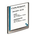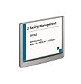 Moderná informačná tabuľka na dvere s lemom v atraktívnej grafitovej farbe. Predný panel sa otvára na jedno zatlačenie, a tým sa jednoducho sprístupnia vložené popisné papiere, ktoré sa môžu vymieňať podľa potrieb. Tabuľka je ideálna do kancelárií, úradov, škôl, univerzít a hotelov. Súčasťou balenia je montážna sada s názorným návodom. Namiesto pevného montovani
