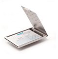 Elegantná a praktická hliníková krabička na vizitky. Vnútorné rozmery 90 × 55 mm. Kapacita 2 × 10 vizitiek. Vnútorný priestor rozdelený priečkou na 2 časti. Matná úprava. Farba strieborná.Vnútorné rozmery: 90 x 55 mmKapacita: 2x10 vizitiekÚprava: strieborná matná