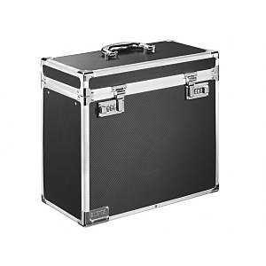 Stabilný a pevný archivačný box uzamykateľný kľúčom alebo na kód, vhodný na uloženie 20 ks závesných obalov A4 alebo cenných predmetov (notebook, cennosti). Materiál silný drevnatý kartón potiahnutý pevným plastom. Box je vybavený pochrómovanými hranami a oceľou zosilnenými rohmi, kovovým madlom na veku, popruhom na rameno, úzkym bočným profilom na ľahký prenos a menovkou na popis obsahu. Závesné obaly nie sú súčasťou dodávky.| Vlastnosti produktu | |