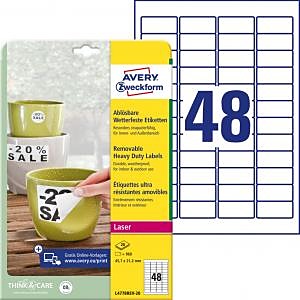 Veľmi odolné polyesterové etikety s nepermanentným lepidlom umožňujú odlepenie etikety bez zanechania stôp po lepidle. Sú odolné voči natrhnutiu, mastnote, nečistotám, UV žiareniu a teplotám od −20 ° do +80 °C a vhodné pre tlač v laserových tlačiarňach a kopírkach. Rozmery v mm : 45,7 × 21,2. Farba biela. Etikety na hárku 48 kusov. Balenie 20 hárkov.| Vlastnosti produktu | |