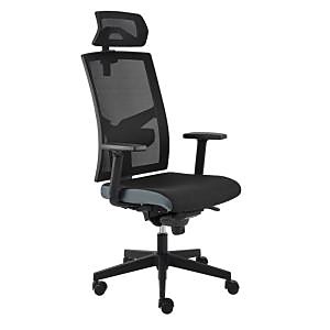 Kancelárska stolička vyššej kategórie z radu GAME s výškovo nastaviteľným čiernym sieťovaným operadlom s mechanickým zámkom a samostatne výškovo nastaviteľnou bedrovou opierkou.