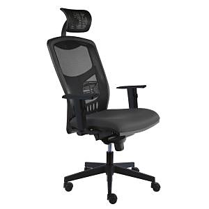 Moderná kancelárska stolička s vysokým fixným sieťovaným operadlom s výškovo nastaviteľnou bedrovou opierkou a s bohatým čalúnením sedadla.
