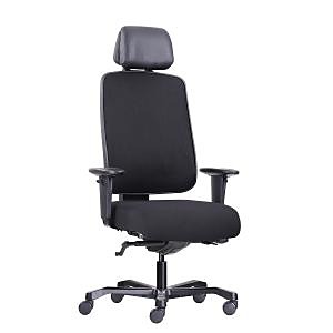 Kreslo špeciálne konštruované pre vysoké a ťažké postavy s aplikáciami 24/7 a nosnosťou 200 kg - intenzívne použitie, extra vysoké podporované operadlo potiahnuté látkou a opierkou hlavy čalúnená hovädzie usní pre jednoduchú údržbu.
