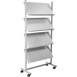Vysoko kvalitný elegantný a pevný mobilný prezentačný stojan na časopisy alebo katalógy formátu A4. Dodávaný v rozloženom tvare. Materiál kov. Farba svetlosivá/ čierna. Štyri police s možnosťou fixácie v 3 sklonoch na max. 12 × A4 formátov. Rozmery (š × v × h) 750 × 1 570 × 360 mm.| Vlastnosti produktu | |