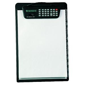 Pevná písacia podložka A4 z tvrdého plastu s kovovým klipom a kalkulačkou, umiestnenou na klipe.| Vlastnosti produktu | |