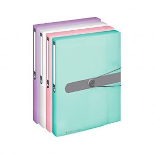 Box z polypropylénu Pastell na dokumenty formátu A4. Kapacita 400 listov, šírka chrbta 4 cm. Zatváranie sivou gumičkou o sivý plastový krúžok, nalepený chrbtový štítok na popis obsahu. Väčšie balenie 10 ks. Farba priehľadná fialová.| Vlastnosti produktu | |