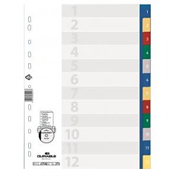 Farebný číselný rozraďovač vyrobený zo zosilneného plastu s eurodierovaním, popisovateľný papierový titulný list na ľahkú orientáciu v dokumentoch. Výsledný dokument pôsobí upravene a reprezentatívne. Väčšie balenie 20 sád.| Vlastnosti produktu | |