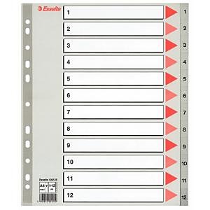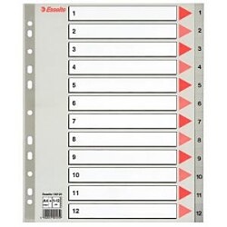 Číselný rozraďovač z polypropylénu. Eurodierovanie, popisovateľný kartónový titulný list na ľahkú orientáciu v dokumentoch. Formát A4 maxi rozmerov 245×297 mm umožňuje rozlíšenie dokumentov založených v zakladacích obaloch. Balenie jedna sada v polyesterovom sáčku. Väčšie balenie 10 sád. Farba sivá.| Vlastnosti produktu | |