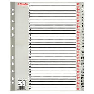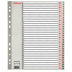 Číselný rozraďovač z polypropylénu. Eurodierovanie, popisovateľný kartónový titulný list na ľahkú orientáciu v dokumentoch. Formát A4 maxi rozmerov 245×297 mm umožňuje rozlíšenie dokumentov založených v zakladacích obaloch. Balenie jedna sada v polyesterovom sáčku. Väčšie balenie 10 sád. Farba sivá.| Vlastnosti produktu | |