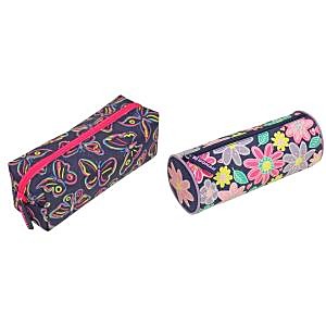 Puzdro na perá s jedným zipsom, dva rôzne tvary a farby, polyesterový materiál, farebná podšívka. Rozmery peračníka Motýle (D x Š x V): 22 x 8 x 7,5 cm / Rozmery peračníka Kvety: 21,5 x 8 x 8 cm| Vlastnosti produktu | |