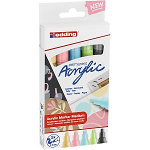 Akrylový popisovač na maľovanie na svetlé alebo tmavé povrchy, ideálny na materiály ako plátno alebo maliarsky papier. Šírka stopy okrúhleho hrotu je 2-3 mm. Vysoko kvalitná pigmentovaná akrylová farba na báze vody je po zaschnutí permanentná, nepriehľadná, svetlostála a bez zápachu. Súprava obsahuje pastelovožltú, pastelovomodrú, pastelovozelenú, klasickú slezovú a antracitovú farbu. Dodávaný v kvalitnom, znovu použiteľnom puzdre. Vhodné náhradné hroty (edding 5100 náhradné hroty) sú dostupné. Sada 5 kusov. Farba pastelový mix.