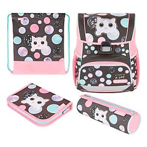Školská taška s výbavou, ergonomicky tvarovaným a priedušným polstrovaním chrbta, nastaviteľnými ramennými popruhmi, výškovo nastaviteľným hrudným pásom, hlavným vreckom s priestorom na knihy, bočnými vreckami s elastickými pásikmi, predným vreckom na zips, stabilnou spodnou doskou s nožičkami, pohodlnou rukoväťou a reflexnými prvkami Oralite. Hmotnosť 950 g, objem 16 l, rozmery 37 x 31 x 22 cm. Vode-odolná, bez PVC, výbava: peračník, vrecko na prezuvky, okrúhle puzdro. Certifikát ergonómie 2023 a 2025. Materiál: polyester.| Vlastnosti produktu | |