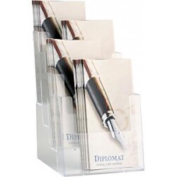 Stojan na prospekty formátu A5 so štyrmi oddielmi. Materiál priehľadný číry plast. Rozmery (š x v x h) 165 x 260 x 155 mm.| Vlastnosti produktu | |