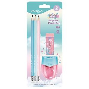 Súprava pastelových grafitových ceruziek KEYROAD, 5 ks: grafitová ceruzka trojuholníková, s gumou 3 ks, strúhadlo plastové dvojité, s nádobkou 1 ks, mäkká guma 1 ks. Balenie: blister. Farba: mix farieb.| Vlastnosti produktu | |
