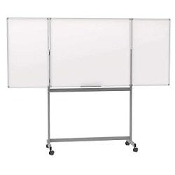 Veľká plocha na písanie na minimálnom priestore - 5 popisovateľných strán, dve vyklápateľné krídla. Povrch tabule z oceľového plechu s plastovou povrchovou úpravou, vhodný na časté používanie. Magneticky priľnavé, popisovateľné a stierateľné nasucho. Profil rámu tabule zo strieborného eloxovaného hliníka. Mobilná vďaka štyrom veľkým dvojitým otočným kolieskam s ľahkým chodom, s možnosťou zaistenia. Kovová odkladacia miska, ktorú možno vysunúť smerom nadol. Dvojitá pracovná plocha, biela tabuľa na oboch stranách.| Vlastnosti produktu | |