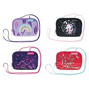 Taštička na krk pre dievčatá. Krúžok na kľúče, 1 hlavné vrecko na zips, 3 menšie vnútorné vrecká, jedno na zips. Rozmery: 14,5 x 10,5 x 2 cm. Mix motívov: Pierka, Jednorožec, Kvietky a Motýlikovia.| Vlastnosti produktu | |