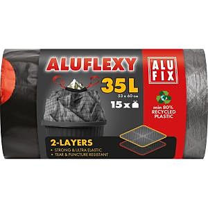 Vrecia na odpad, unikátne, flexibilné, 2 vrstvové, čierna vrstva - taška silná, extra elastická, strieborná vrstva - odolná voči roztrhnutiu a prepichnutiu. Nosnosť odpadu 21 kg. LDPE, 53 x 60 cm, 15 kusov na rolke, 28 mikrónov.| Vlastnosti produktu | |
